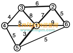 试题1: 煤气公司想要在某地区高层住宅楼之间铺设煤气管道并与主管道相连,位置如下图所示,节点代表各住宅的楼和主管道位置,线上数字代表两节点间距离(单位:百米),则煤气公司铺设的管道总长最短为()米。