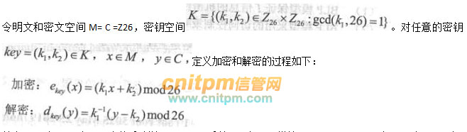 仿射密码是一种典型的对称密码算法。仿射密码体制的定义如下: