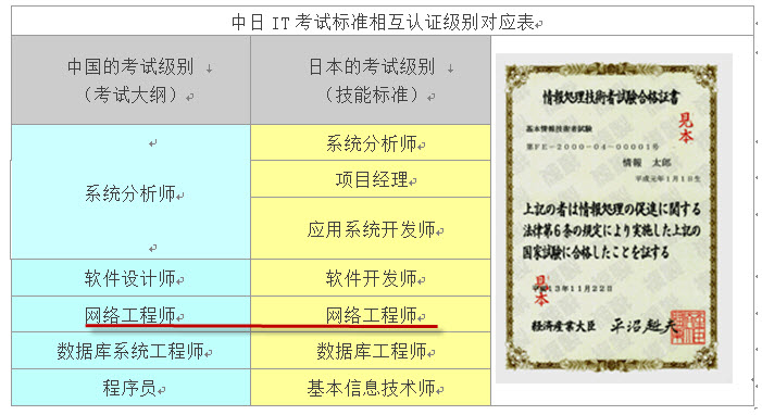 信息产业部电子教育中心与日本信息处理技术人员考试中心分别受信息产业部和日本经济产业省委托,于2005年3月3日就中国计算机技术与软件专业技术资格(水平)考试与日本信息处理技术人员考试的考试标准,再次签署了互认的协议。中国的程序员、软件设计师和系统分析师考试,早在2002年1月31日实现了中日互认,这次互认增加了网络工程师、数据库系统工程师两个级别。