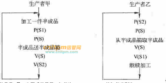 某企业生产流水线M共有两位生产者,生产者甲不断地将其工序上加工的半成品放入半成品箱,生产者乙从半成品箱取出继续加工。假设半成品箱可存放n件半成品,采用PV操作实现生产者甲和生产者乙的同步可以设置三个信号量S、S1和S2,其同步模型如下图所示。信号量S是一个互斥信号量,初值为 (1);S1、S2的初值分别为 (2)。(1)A.0B.1C.nD.任意正整数(2) A.n、0B.0、nC.1、nD.n、1