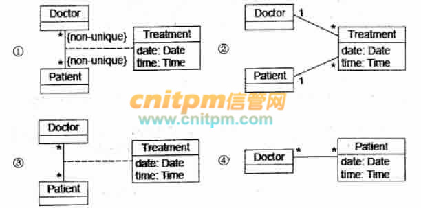 下图①②③④所示是 UML( )。现有场景:一名医生(Doctor)可以治疗多位病人(Patient),一位病人可以由多名医生治疗,一名医生可能多次治疗同一位病人。要记录哪名医生治疗哪位病人时,需要存储治疗(Treatment)的日期和时间。以下①②③④图中( )。是描述此场景的模型A.用例图B.对象图C.类图D.协作图A.①B.②C.③ D.④