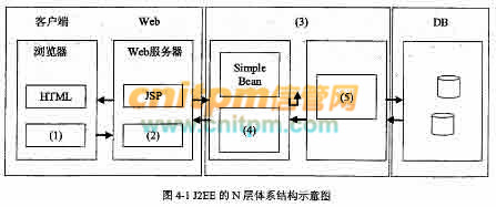 J2EE平台采用了多层分布式应用程序模型,实现不同逻辑功能的应用程序被封装到不同的构件中,处于不同层次的构件可被分别部署到不同的机器中。请填写图4-1中(1)~(5)处的空白,完成J2EE的N层体系结构。