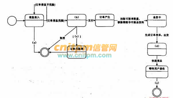 在面向对象的设计过程中,状态图(statechartdiagram)描述了一个实体基于事件反应的动态行为。请根据题干描述,填写图2-1中的(a)~(e)空白,完成订单处理的状态图。