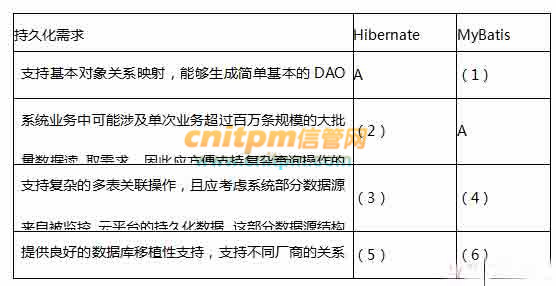 在确定系统釆用的持久层技术方案时,项目组梳理了系统的典型持久化需求,对照需求对比分析了Hibernate和MyBatis两种持久化方案,请分析两种持久化方案对表5-1中所列项目需求的支持情况,将候选答案序号A或B填入表5-1相应位置。