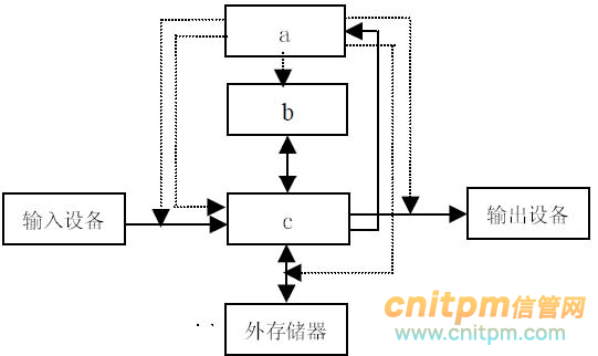 计算机各功能部件之间的合作关系如下图所示。假设图中虚线表示控制流,实线表示数据流,那么a、b和c分别表示 () 。