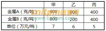 某化工企业接到一份10吨新材料研发的订单100万元,该材料由甲、乙、丙三种原材料构成,其中所含金属A不少于4400克,金属B不少于4800克,金属A和金属B在原材料中的含量及单价如下表所示。经过不断测算和实验,为了获得满足客户要求的这种新材料,该企业最多可获得的利润为()万元。