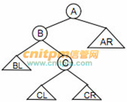 下图所示平衡二叉树(树中任一结点的左右子树高度之差不超过1)中,结点A的右子树AR高度为h,结点B的左子树BL高度为h,结点C的左子树CL、右子树CR高度都为h-1。若在CR中插入一个结点并使得CR的高度增加1,则该二叉树 ( ) 。 A、以B为根的子二叉树变为不平衡 B、以C为根的子二叉树变为不平衡 C、以A为根的子二叉树变为不平衡 D、仍然是平衡二叉树