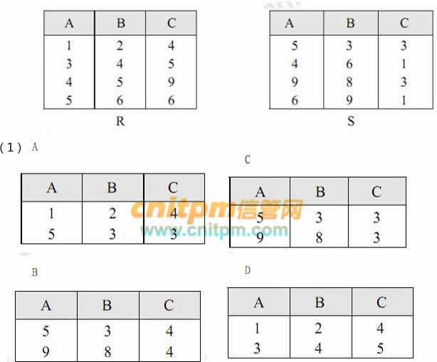 关系 R、S 如下图所示,关系代数表达式π3,4,5(σ1<6(R×S) )=(1),对关系 R、S 进行自3,4,5然连接后的属性列数和元组个数分别为 (2) 。 (1)A. AB. BC. CD. D(2)A、3 和 0 B、3 和 2 C、6 和 0 D、6 和 2