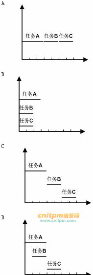某项目制定的开发计划中定义了3个任务,其中任务A首先开始,且需要3周完成,任务周完B必须在任务A启动1周后开始,且需要2周完成,任务C必须在任务A后才能开始,且需要完成2周完成。该项目的进度安排可用下面的甘特图 ( ) 来描述。 A. AB. BC. CD. D