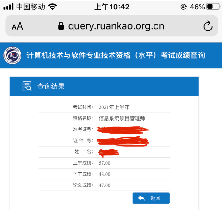 考完试搜索了各大报班的学员群成绩,基本反映是2021年上半年信息系统项目管理师为放水一年,题目难度降低;上午选择题57分,基本考完试就百分百相信上午过了;下午因为案例没做完,论文写字慢,写字潦草基本断定没有考过;实际上查到成绩的一刻,基本属于惊喜,手抖状态!现在话不多说,总结备考经验如下: