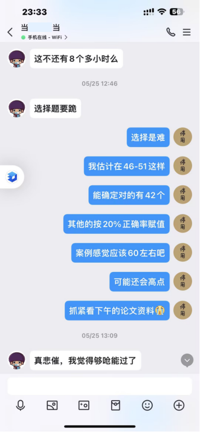 总体感觉时间虽短,但功夫不负有心人,能取得的每一分也在意料之中,考试当天上午考完选择题和案例时,在考场用草稿纸给自己打分估分(后附跟其他同期学友的交流截图,最终结果出来也差不多),所以无论其他人的经验多么好,学友们还是要自己认真投入时间,不可依赖于投机哦。