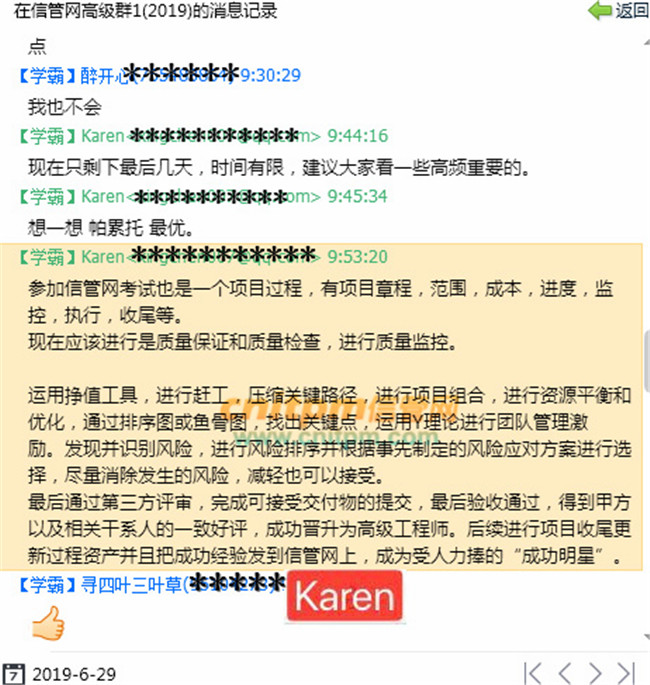 我会在周末找一段比较长的时间,然后坐来来,有一个本子,把做过的所有10套题所有答题过程中,做错的题标出来,最后发现比较好玩的就是错的题很多都是重复的,比如3、4次做题都是同一题出错,这时我就重点再仔细去通过百度、JRS直播等,把这个题彻底搞清楚,比如常见出错的风险识别,风险分类;总时差、自由时差;管理储备、应急储备;邀约与要约;成本估算与成本预算;风险规避与风险转移等等。