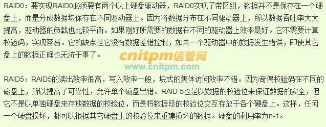 比如一个文件10M大小,它分成5份,每份2M,同时往5块硬盘上写。提高了写的速度,但如果其中一块硬盘坏了,这个10M的文件就无法读回10M了。。。所以不能保证可靠性。。。