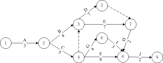 如图所示,根据上图可识别出关键路径有两条,分别为:ACDHJ和ACEHJ,工期为19天。