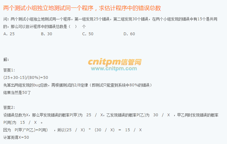 两个小组独立地测试同一个程序,第一组发现50个错误,第二组发现70个错误,在两个小组发现的错误中有35个是共同的,那么可以估计程序中的错误总数是( )个。