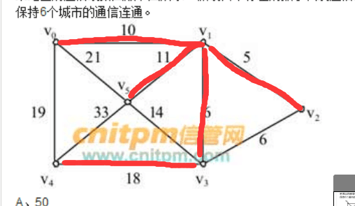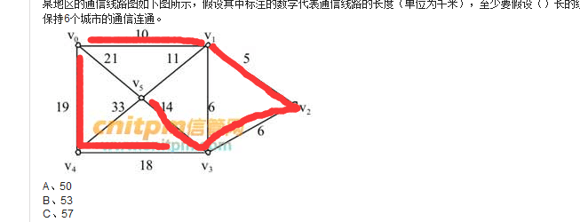 某地区的通信线路图如下图所示,假设其中标注的数字代表通信线路的长度(单位为千米),至少要假设()长的线路,才能保持6个城市的通信连通。
