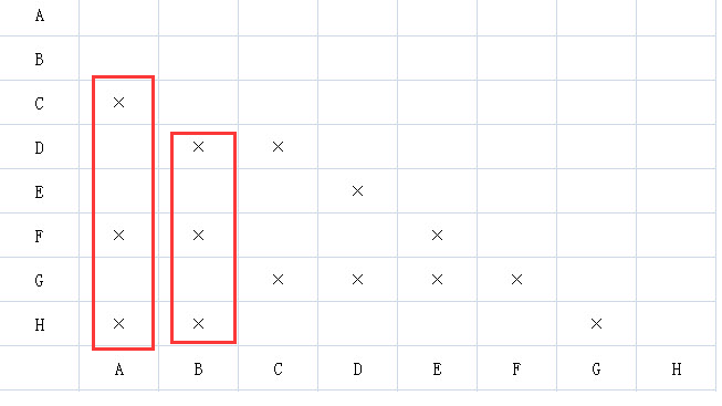 有八种物品A、B、C、D、E、F、G、H要装箱运输,虽然量不大,仅装1箱也装不满,但出于安全考虑,有些物品不能同装一箱。在下表中,符号“×”表示相应的两种物品不能同装一箱。运输这八种物品至少需要装()箱
