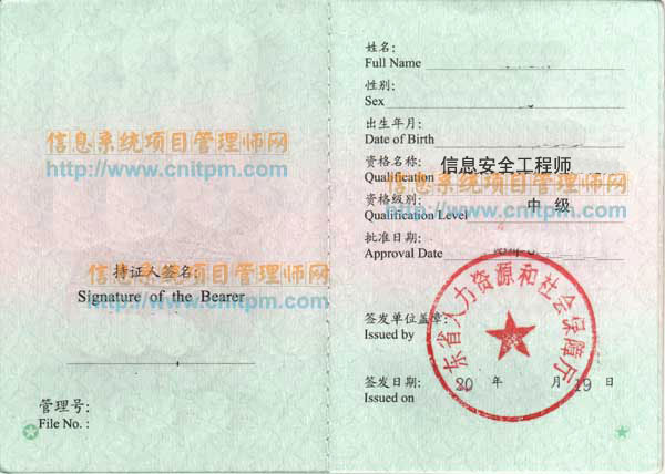 信息安全工程师考试合格者将颁发由人力资源和社会保障部和工业和信息化部共同盖章的信息安全工程师证书,以下为证书样本: