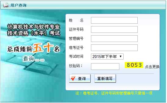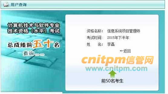 近日,软考办网站公布了2015年下半年计算机技术与软件专业技术资格(水平)考试信息系统项目管理师等考试的全国前50名人员的查询,如果您是考的信息系统项目管理师并且总分在165分左右及以上,可以在以下地址查询是否为全国前50名,欢迎全国前50名人员与我们联系,我们将颁发荣誉证书并给予一定奖励,联系QQ:270019001。