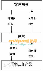 上图说明了四类需求跟踪能力链。客户需求可向前追溯到需求,这样就能区分出开发过程中或开发结束后由于需求变更受到影响的需求。这也确保了需求规格说明书包括所有客户需求。同样,可以从需求回溯相应的客户需求,确认每个软件需求的源头。如果用使用实例的形式来描述客户需求,图的上半部分就是使用实例和功能性需求之间的跟踪情况。图的下半部分指出:由于开发过程中系统需求转变为软件需求、设计、编写等,所以通过定义单个需求和特定的产品元素之间的(联系)链可从需求向前追溯。这种联系链使你知道每个需求对应的产品部件,从而确保产品部件满足每个需求。第四类联系链是从产品部件回溯到需求,使你知道每个部件存在的原因。绝大多数项目不包括与用户需求直接相关的代码,但对于开发者却要知道为什么写这一行代码。如果不能把设计元素、代码段 或测试回溯到一个需求,你可能有一个“画蛇添足的程序”。然而,若这些孤立的元素表明了一个正当的功能,则说明需求规格说明书漏掉了一项需求。