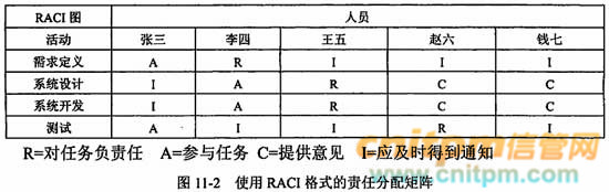 反映团队成员个人与其承担的工作之间联系的方法有多种,而责任分配矩阵(RAM)是最直观的方法。在大型项目中,RAM可以分成多个层级。例如,高层级的RAM可以界定团队中的哪个小组负责工作分解结构图中的哪一部分工作(component);而底层级的RAM被用来在小组内,为具体活动分配角色、职责和授权层次。矩阵格式,又称表格,可以使每个成员看到与自己相关的所有活动以及和某个活动相关的所有成员。责任分配矩阵有时在矩阵中以字母引用。例如,图11-2中所示的RAM可以被称为RACI图(Responsible负责-Accountable参与-Consult征求意见-Inform通知)。下图11-2中左边一列代表的是各项活动,右边各列的第一行代表的是人员(也可以是小组或部门)。