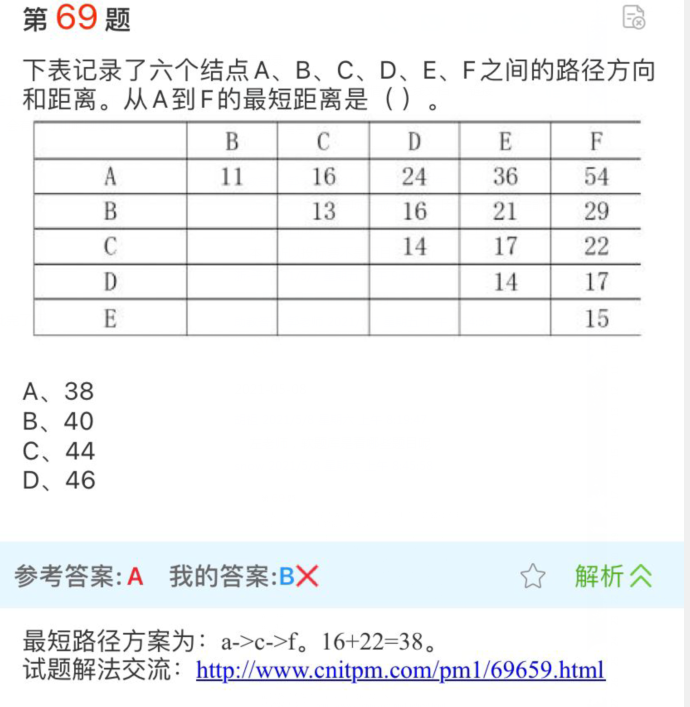 这个题,可以很简单的试出来。先从A直接到F 是54。然后再从A到B再到F是11+29=40。最终得出A到C再到F的路径最短,为16+22=38