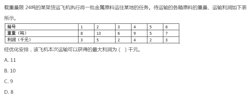 本题属于运筹学的内容,考查运筹学中运输问题。在给定有限集的所有具备某些条件(总载重≤24吨)的子集中,按某种目标找出一个最优子集(总利润最大)。因待运输的箱子有限,因此在实际工作中,可以用工具软件来解决此类问题或自己编程解决。针对本题而言,因箱子的数量只有6个,因此用手工处理方法,按利润从高到低进行排列即可找到总利润最大的一种组合。在满足载重量要求的前提下,具体的几个方案如下: