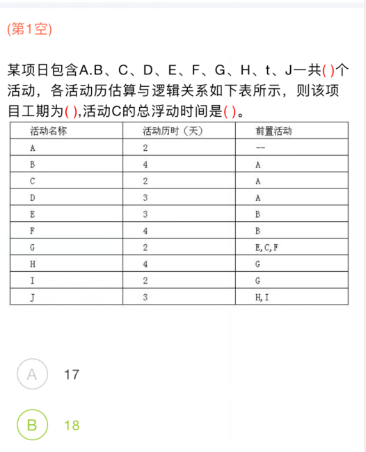 项目关键路径为ABEGHJ 和ADFGHJ ,总工期为:2+4+3+2+4+3=18。活动C 的最早完成时间为4,最晚完成时间为9,总时差=最晚完成时间—最早完成时间=9-4=5。