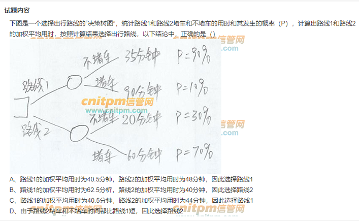 下图是一个选择出行路线的“决策树图”,统计路线1和路线2堵车和不堵车的用时和其发生的概率(P)计算出路线1和路线2的加权,平均用时,按照计算结果选择出行路线,以下结论中,正确的是()