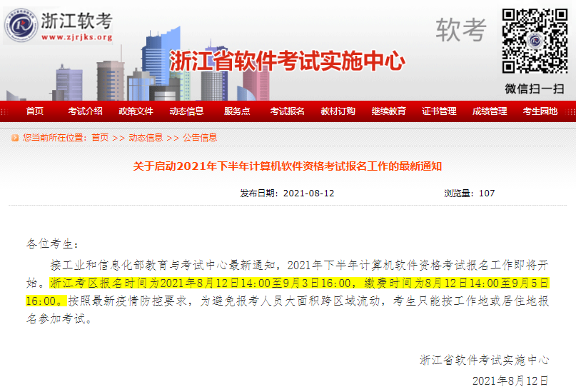 接工业和信息化部教育与考试中心最新通知,2021年下半年计算机软件资格考试报名工作即将开始。浙江考区报名时间为2021年8月12日14:00至9月3日16:00,缴费时间为8月12日14:00至9月5日16:00。按照最新疫情防控要求,为避免报考人员大面积跨区域流动,考生只能按工作地或居住地报名参加考试。