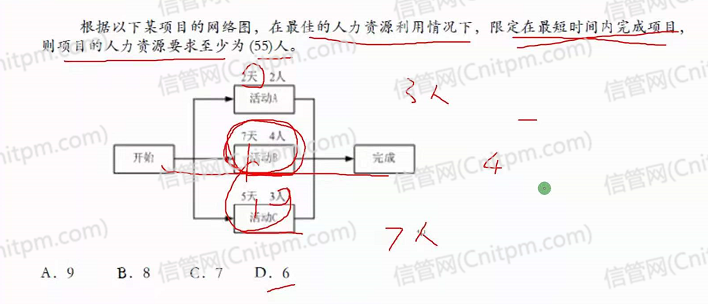 具体的分析过程,我一般这种题分析的时候会用到自由时差,不知道对不对,B活动在关键路径上,一刻也不能耽搁,B开始时,因为要求限定最短时间完成,最佳资源,所以BA首先并行开展,需要6人,2天之后A活动做完了,这道题C活动的自由时差刚好是,2,也就是说A完成时,C必须开展了,所以,BC并行,5天正好全部做完,需要4+3=7人