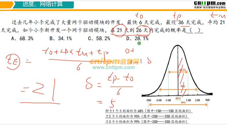 算出期望工期21天,标准差5天后,正负1个标准差范围是指【21-5, 21+5】