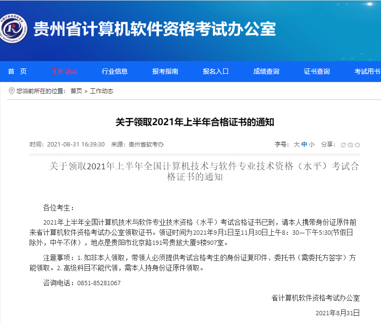 2021年上半年全国计算机技术与软件专业技术资格(水平)考试合格证书已到,请本人携带身份证原件前来省计算机软件资格考试办公室领取证书。领证时间为2021年9月1日至11月30日上午8:30—下午5:30(节假日除外,中午不休),地点是贵阳市北京路191号贵旅大厦9楼907室。