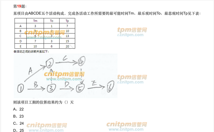 三点估算:活动历时均值(期望工期) = (乐观时间+4*最可能时间+悲观时间) /6