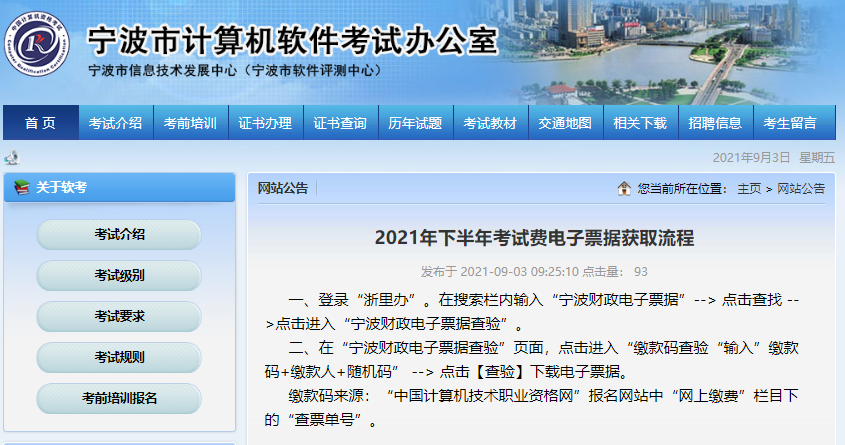 根据宁波市计算机软件考试办公室发布的《2021年下半年考试费电子票据获取流程》,自9月3日起,报考成功人员可在“宁波财政电子票据查验”页面下载电子票据。具体流程以通知为准。