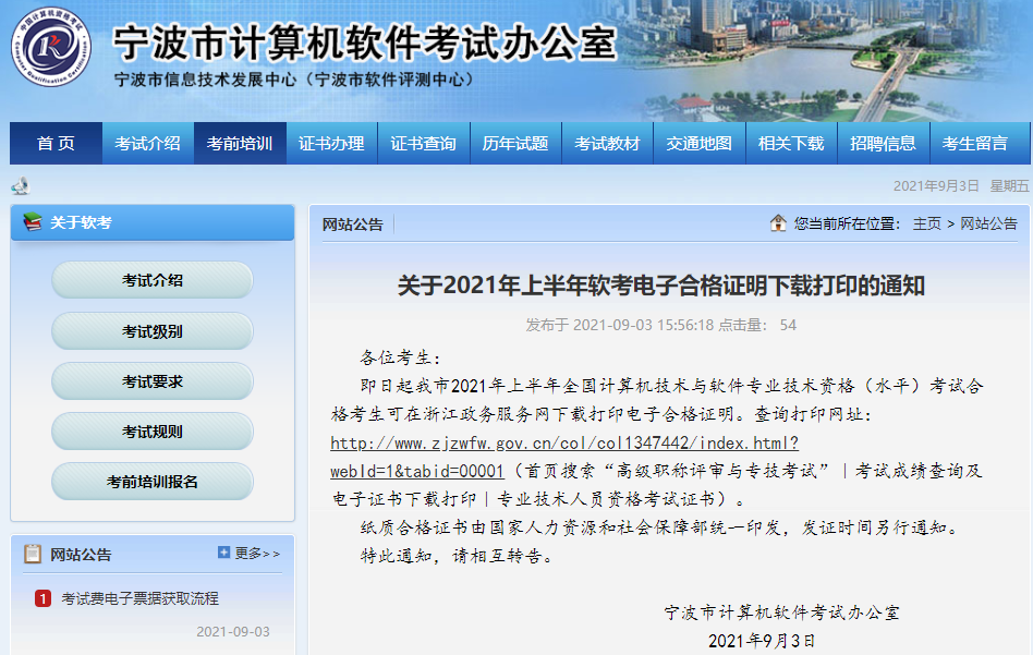 即日起我市2021年上半年全国计算机技术与软件专业技术资格(水平)考试合格考生可在浙江政务服务网下载打印电子合格证明。查询打印网址:http://www.zjzwfw.gov.cn/col/col1347442/index.html?webId=1&tabid=00001(首页搜索“高级职称评审与专技考试”|考试成绩查询及电子证书下载打印|专业技术人员资格考试证书)。