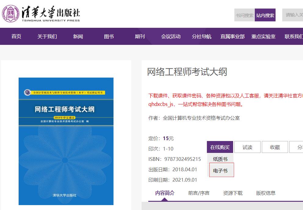 一、登录“清华大学出版社官网”,搜索网络工程师考试大纲;
