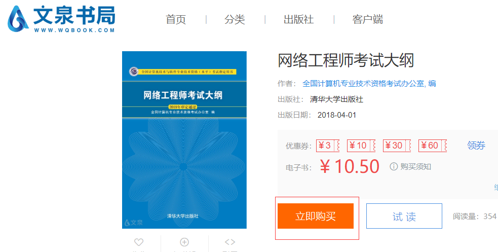 网络工程师考试大纲发布了纸质书籍与电子书籍两个版本,纸质书籍可以在各大正规图书销售渠道进行购买,电子书籍可在“文泉书局”进行网上购买,步骤如下: