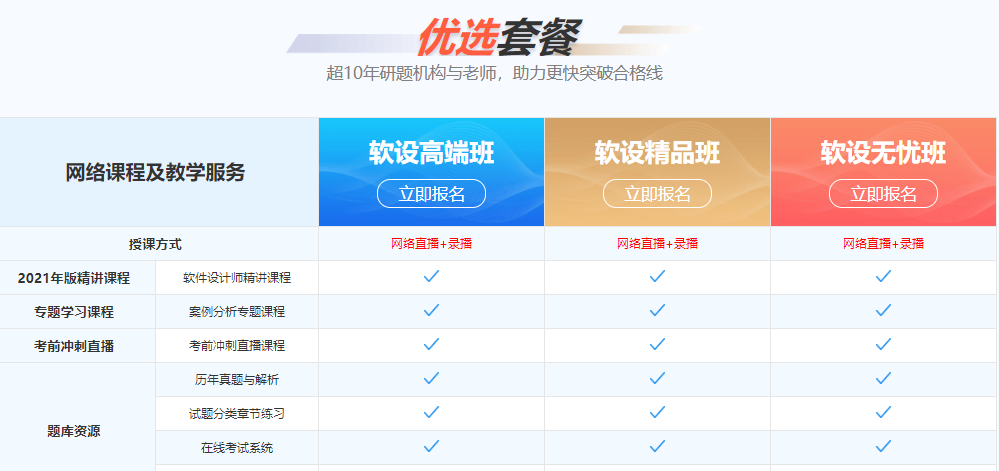 目前JRS直播软件设计师培训设置有高端班、精品班、无忧班多种学习套餐供考生选择,提供更为全面的软件设计师培训服务。