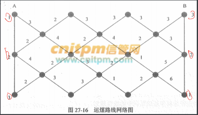 下面的网络图表示从城市A到城市B运煤的各种路线。各线段上的数字表示该线段运煤所需的费用(百元/车)。城市A有三个装货点,城市B有三个卸货点,各点旁标注的数字表示装/卸煤所需的费用(百元/车)。根据该图,从城市A的一个装卸点经过一条路线到城市B的一个卸货点所需的装、运、卸总费用至少为()(百元/车)。