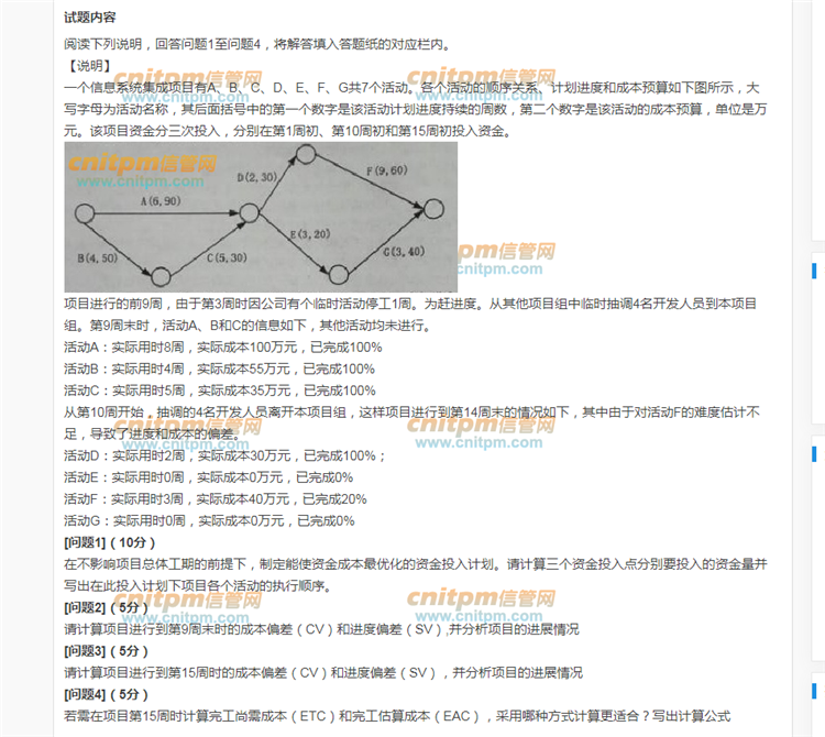 但是题干要求是考虑资金成最优化的资金投入计划,所以,活动E G不在关键路径上,可以利用它们的时差,到15周之后再开展,不影响项目工期