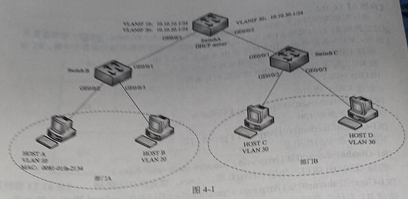 根据业务要求,在部门A中,新加入的MAC地址为0081-01fa-2134,主机HOST A需要加入VLAN 10并获取相应IP地址配置,连接在交换机SwitchB的GE0/0/3接口上的主机需加入VLAN20并获取相应IP地址配置,部门B中的所有主机应加入VLAN30并获取相应IP地址配置。