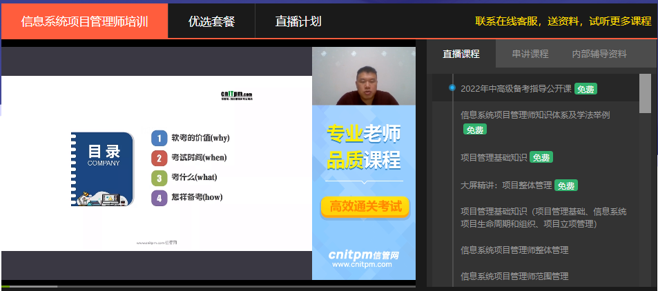 JRS直播专注软考10年,软考课程由信管资深讲师授课,提供无忧班、高端班、精品班等多种学习套餐。