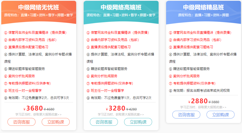 信息系统项目管理师与系统规划与管理师高级科目课程价格从3380元~4580元左右不等;系统集成项目管理工程师、信息安全工程师、软件设计师、网络工程师等中级科目课程价格在2880元~3680元不等(点击查看详情),详细介绍如下: