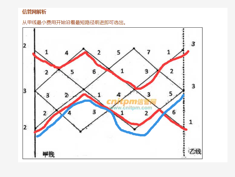 已知网络图各段路线所需费用如下图所示,图中甲线和乙线上的数字分别是对相应点的有关费用,从甲线到乙线的最小费用路线是( 1 )条,最小费用为( 2 )。