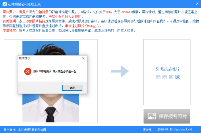 按照软考报名照片要求调整后得到的照片不要直接上传,而是要在报名系统中下载"照片验证工具",用该工具进行审核成功后才能上传,如果照片不符合要求,在验证的时候会有相关提示(如下图所示:蓝底照片提示需要白底),大家按照提示进行修改,直到审核成功才可以。