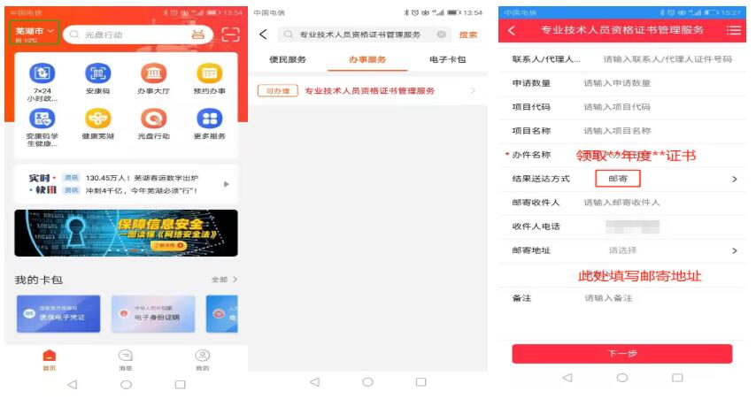 邮寄方式:方式一移动端申请(推荐使用),手机下载皖事通APP,城市选择芜湖,搜索栏搜索“专业技术人员资格证书管理服务”,在线办理。