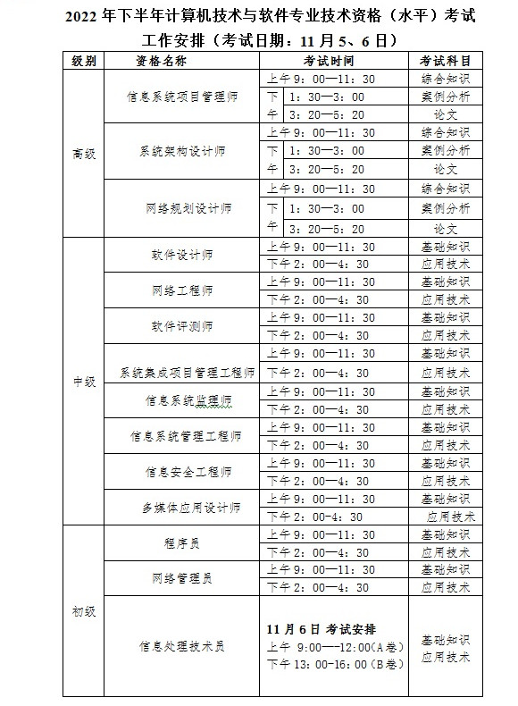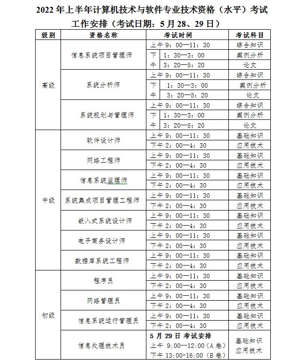 2022年软考上半年和下半年各级别具体考试工作安排如下表: