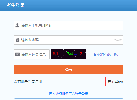 另外考生还可以进入账号注册界面,重新注册试试,手机号或邮箱号只能注册一次,如果注册界面提醒考生,此手机号/邮箱已注册的话,一般就是考生使用过的账号了,接下来可以用上述办法找回密码,重新登录。