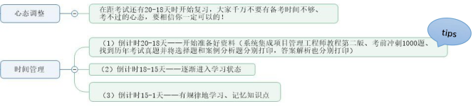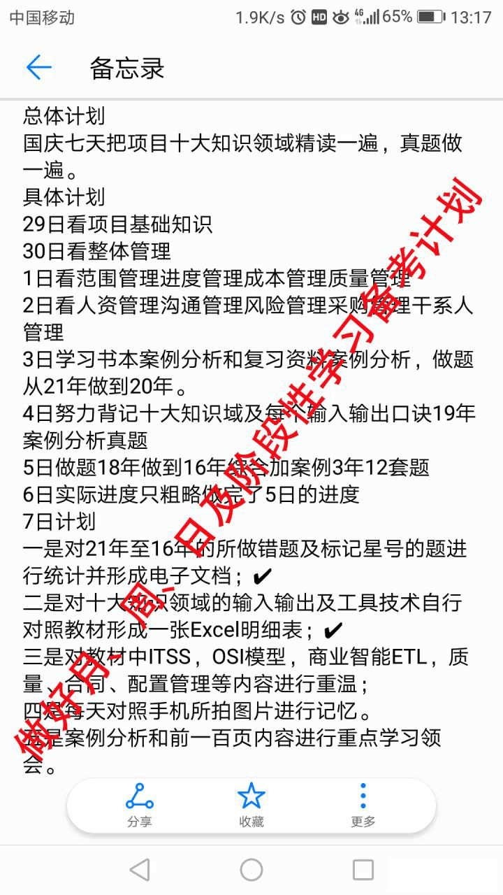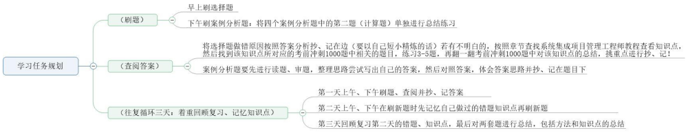 上班族的复习备考时间只能放在下班和周末,还不能影响到平时的工作,故每天能保证专心致志2—3个小时以上的备考时间就是一道难关。时间的不足就必须从效率的提高中弥补,所以制订和落实学习计划非常必要。我参考了 [JRS直播]中级系统集成项目管理工程师90天复习计划,并结合自身实际制定了两个月的复习计划以及周计划、日计划,关键在于督促自己落实好计划进度。但实际问题往往出在自己身上,由于家庭、工作、社交等原因,往往在落实计划上大打折扣。那么,只有通过追加备考时间来赶上学习计划,我记得10月份我每天晚上都复习到12点钟去努力赶上之前拉下的计划进度,为的就是给最终备考留下机动时间。实践证明,科学备考计划为整个备考过程划定了框架,落实计划为备考增加了可行性,两者缺一不可。